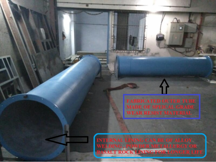 We have developed Outer Tube from High Abrasion Steel Plates having 450 – 550 BHN Hardness. Before Rolling Plates into High Capacity Variable Axis , Pyramid type Plate Rolling Machine , We carried out Surface Preparation as per SA 2 ½ , Which is really a tough job. We carried out Weld Over Lay of High Density of Dendrites of Chromium Carbides without changing the chemistry of the elements. This gave us additional Abrasion Resistance with Hardness of 55 -62 RC. After Weld Over Lay the Plate were fabricated into the Outer Tube. Similar Operations were carried out for Screw Conveyor